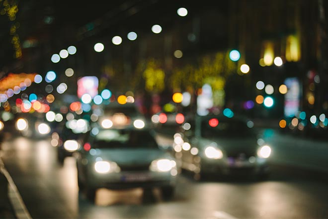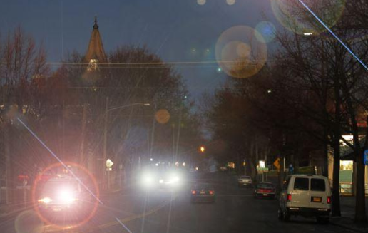 • Glare from headlights, lamps, or sunlight, with a halo around the lights in some cases